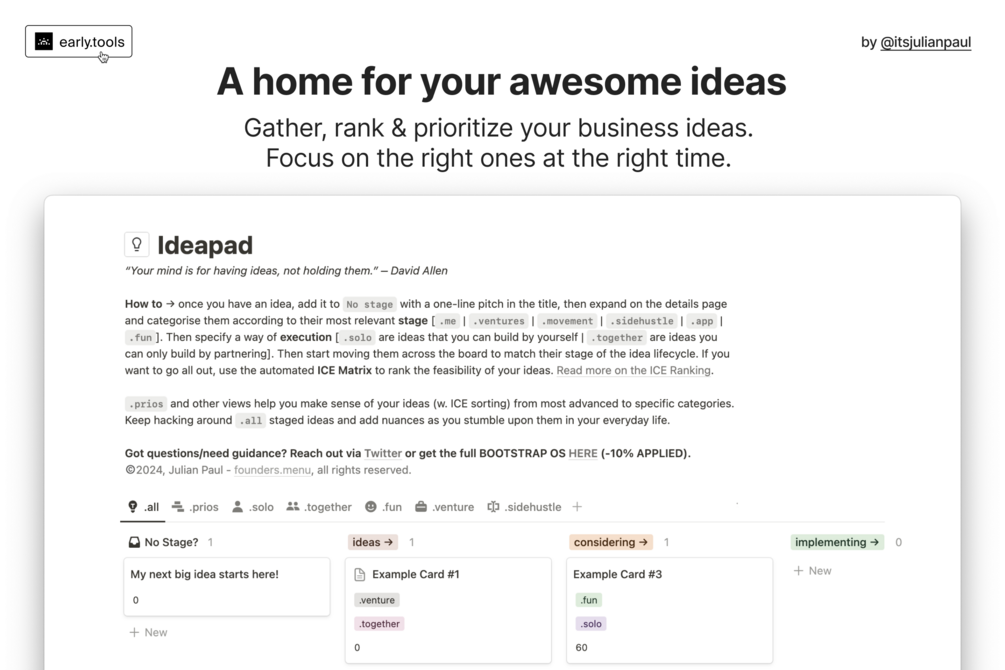 ✧ FOUNDERS Ideapad is part of the early.tools ecosystem, the home to discover & learn from pre-launch startups. ✧ By downloading this product, you will be added to the weekly newsletter via newsletter.early.tools.